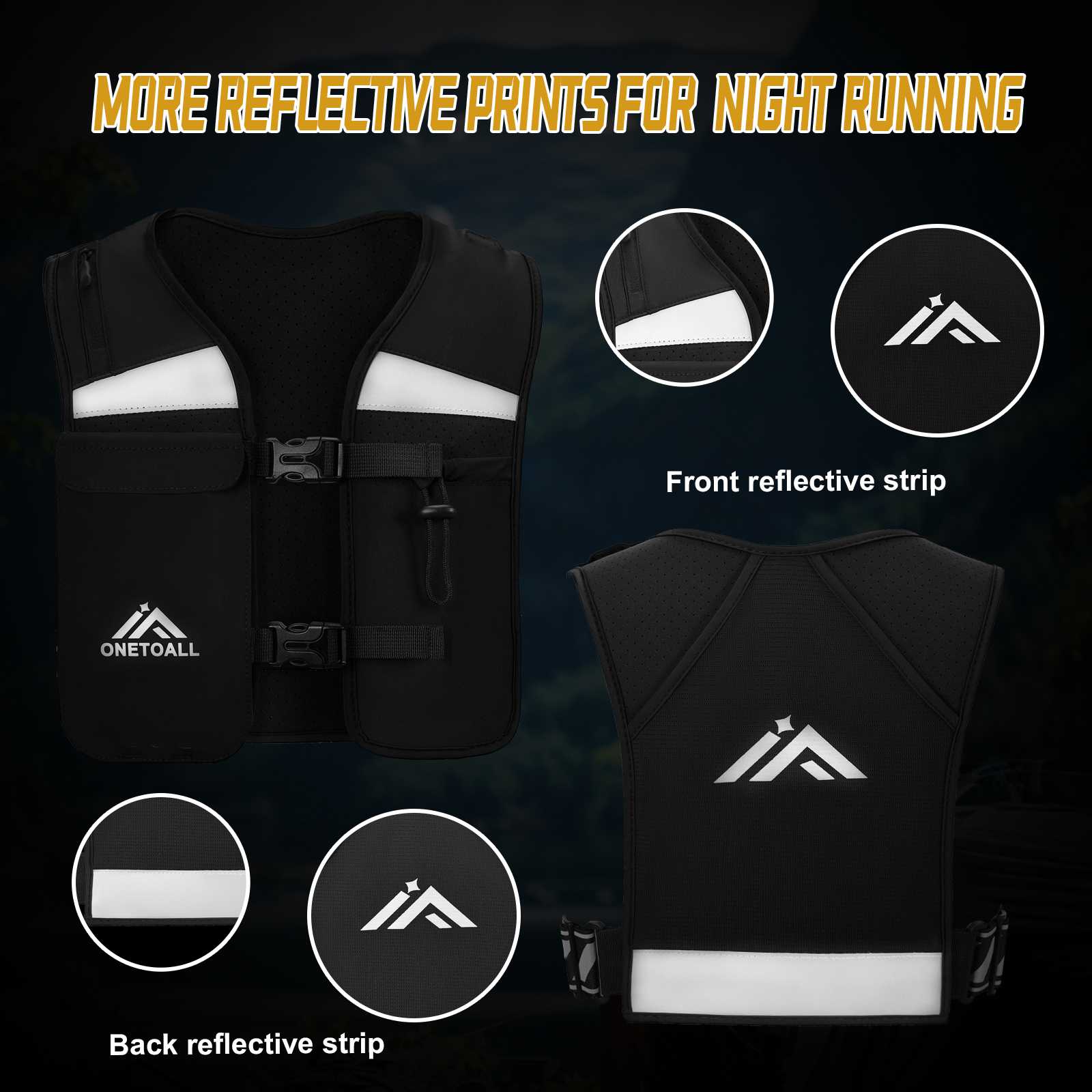 Running at night? Our vest's reflective strips on front, back & waistband make you stand out in the dark, make sure cars spot you from every angle