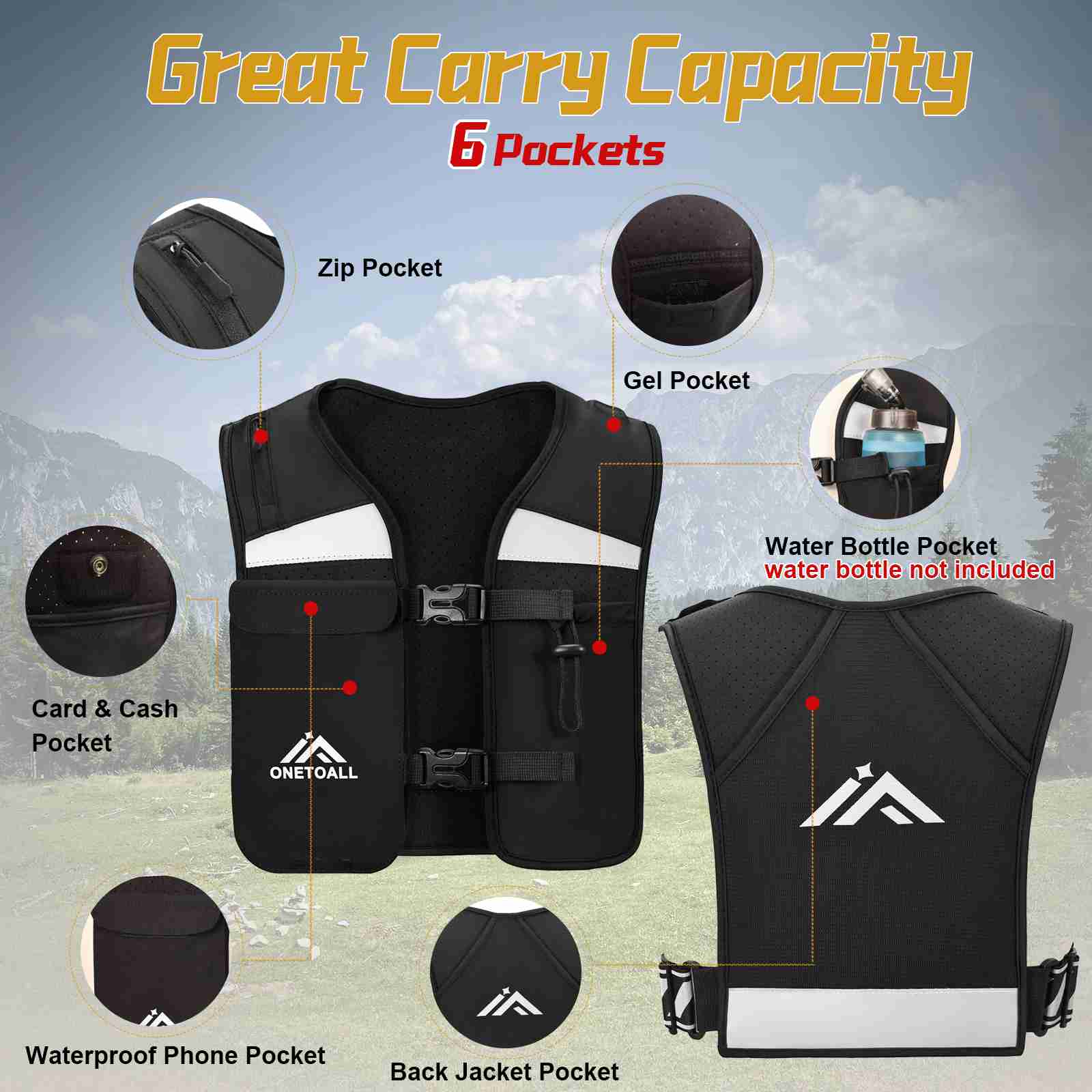 6 functional pockets for runners: Store phone, keys, gels, cards and water bottle in dedicated compartments